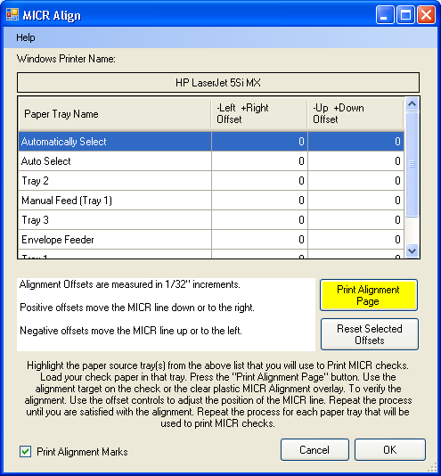 Next the MICR Align screen will appear. Alignment is specific to the paper tray that the check paper is loaded in. Highlight the paper tray name in the list.