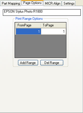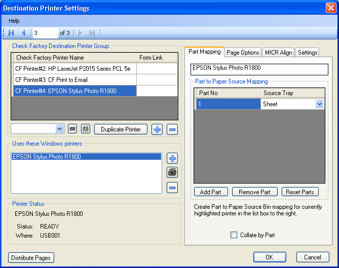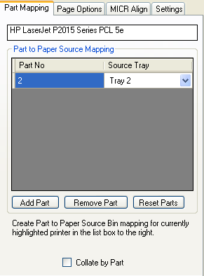 You define the parts that you want printed to this printer. If you don't care what part prints to this printer just leave it at 1. You can print the same part to more than one printer. Along with the part you can choose the printer paper bin that the paper will be pulled from. Great for printing check forms or using colored paper.